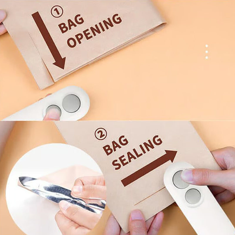 KETTŐS FUNKCIÓS KIVITELEZÉS: A készülék kényelmesen integrálja a tömítő és a vágó készüléket. A rejtett penge lehetővé teszi, hogy könnyedén kinyissa a zsákot, miközben garantálja a biztonságot, és az egyetlen eszköz, amire szüksége van a zsák kezeléséhez.