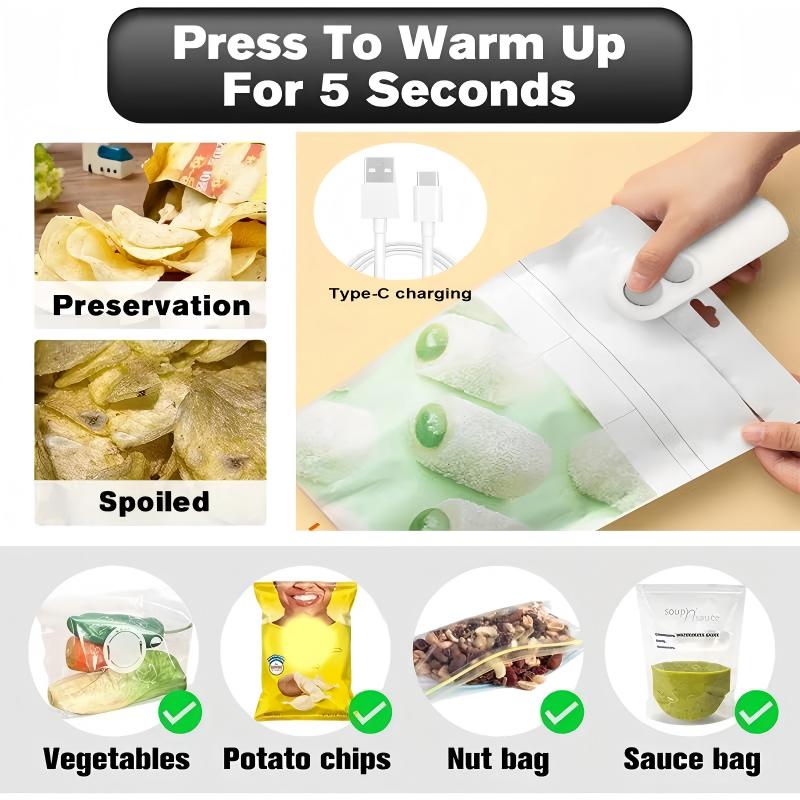 SZÉLES KOMPATIBILITÁS: Hatékonyan lezárja a különböző zacskókat, beleértve a szokásos snack zacskókat, fóliazsákokat és állateledeles zacskókat. Ez a sokoldalúság segít frissen tartani az éléskamrájában található különféle tételeket.