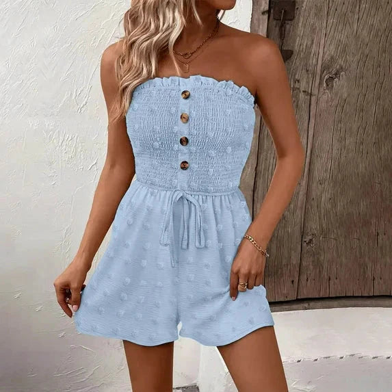 Hozd haza a nĆi Fake Buttons Frill Trim Shirred Tie Front Wide Leg Tube Romper-t mĂ©g ma, Ă©s definiĂĄld Ășjra a stĂlusodat ezzel a minden egyben divatos alapdarabbal. Kattints az alĂĄbbi linkre, hogy a tiĂ©d legyen most!